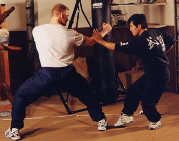 -BIU- Biu - an outward shooting forearm strike. Using both the inner forearm and the fist as the striking surface, this element is frequently used as a follow-up to other elements and strikes. This attack takes the striking surfaces of the inner forearm and fist in a swinging outward motion toward the intended target. An extended version of this element can be used to uproot an opponent, while a compacted variation can be used as a quick and penetrating strike to an opponent's center. |
